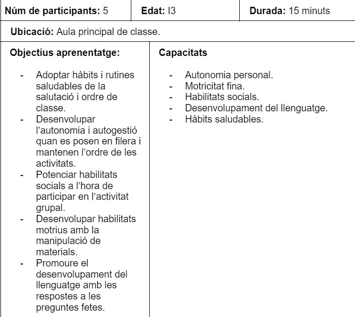 JUSTIFICACIÓ: Aquesta activitat està dissenyada per ajudar els nens i les nenes a establir hàbits saludables des del primer moment del dia (salutacions, repàs de assistència, emocions que senten al dia, etc). És una rutina que incentiva el costum de rutinas i hàbits per al futur, millorant la seva autonomia, independència per comportar tasques i manté la cohesió i consciència grupal.